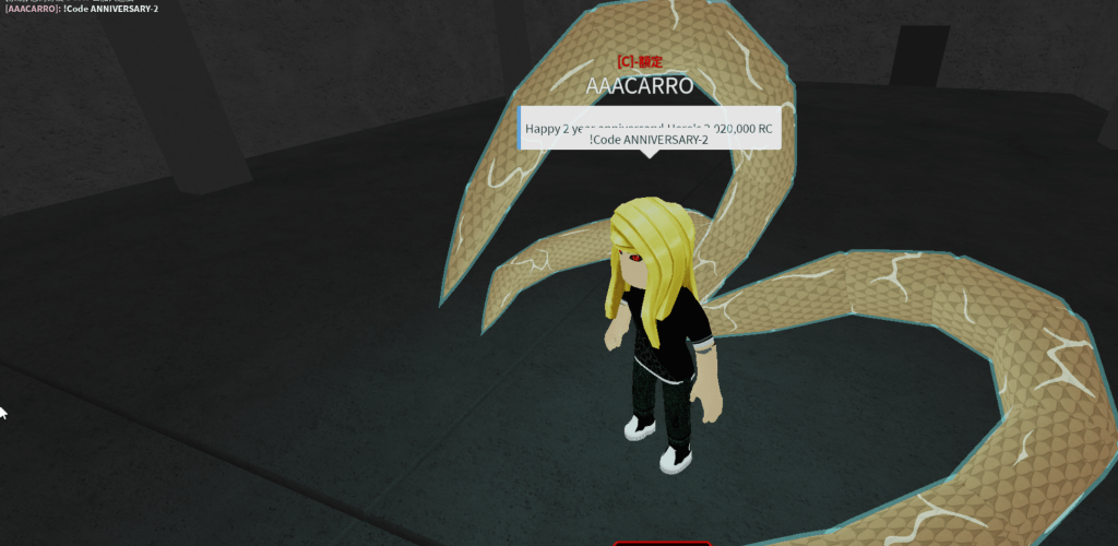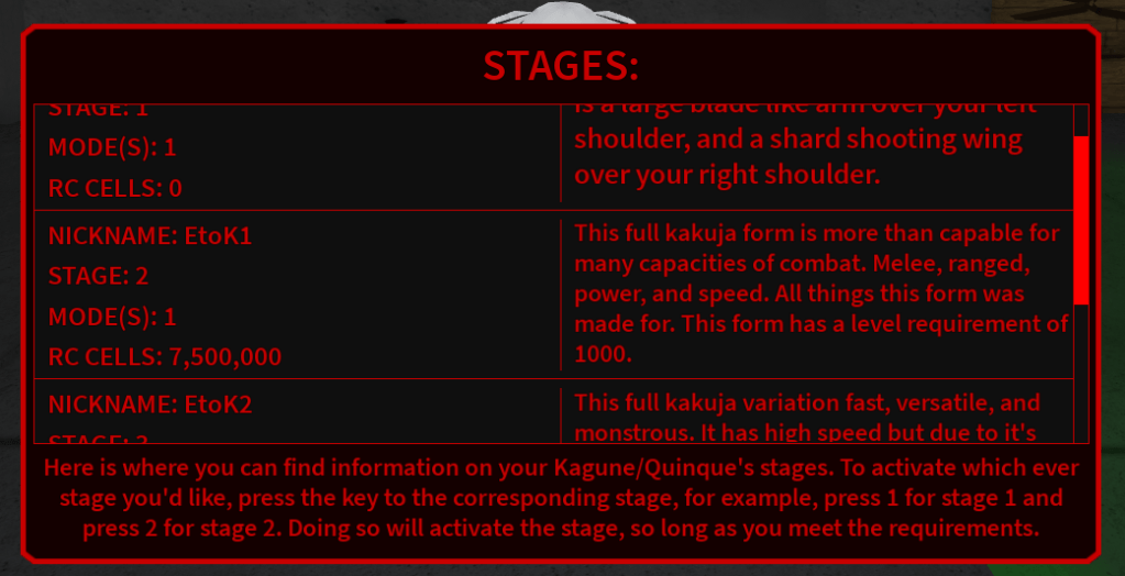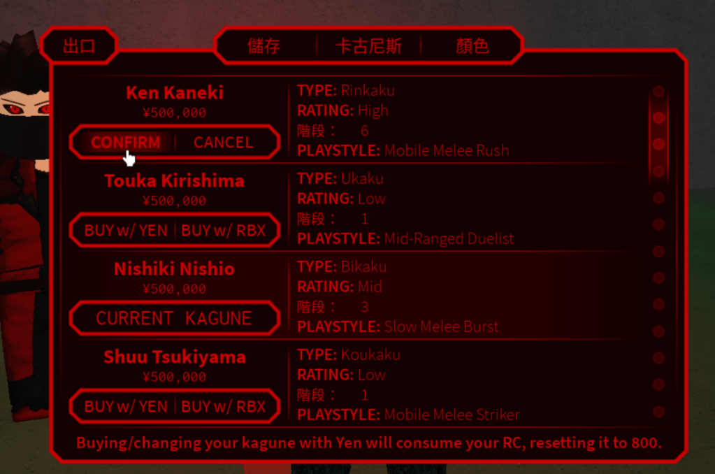 As you can see kagunes can get really big and powerful and can really deal a ton of damage if used correctly. Each kagune has 4~5 attacks(including the left mouse button) and each one of them is different in some way. So back to the point, you spawn in. First things first, press 1 to activate your kagune. if your kagune doesn’t have 3 tentacles sticking out of your butt then you should change yours with yen. But Mattie I don’t have yen I’m poor! No worries man here’s a list of codes down below be sure to enter them. If your kagune is not the 3 tentacles one then enter !Code HNY2020 first in the chat, it would give you 500,000 yen enough to buy Ken Kaneki and it should look like one of the pictures below. After buying Kaneki just enter all of the codes then you should unlock 4 forms by pressing 1~4
