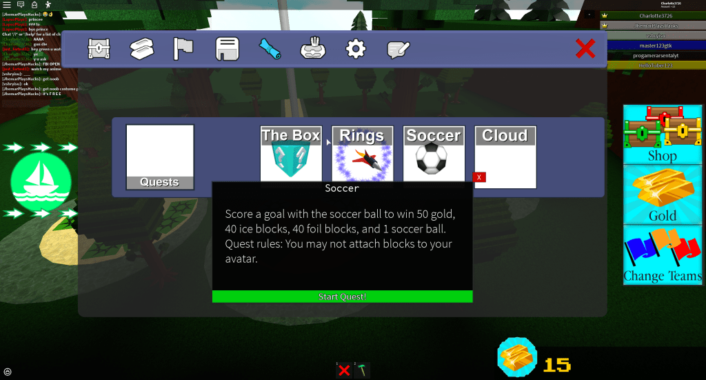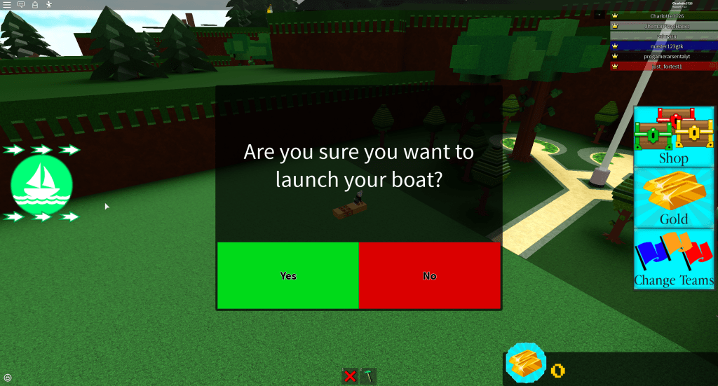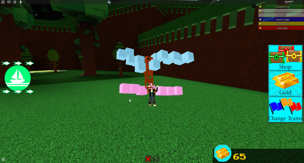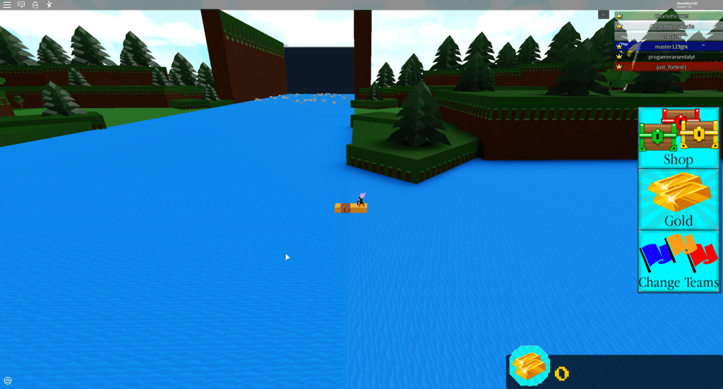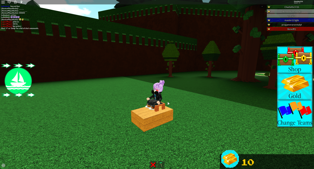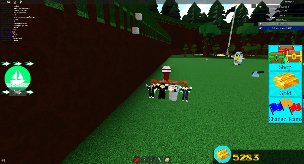 Build a boat for treasure is also a teamwork-based game. The main goal is to build a boat, complete stages and try to get to the treasure! A treasure chest gives 100 gold when touched. When you join the game you have 6 wood blocks to build with and 10 gold to buy more blocks as shown below.